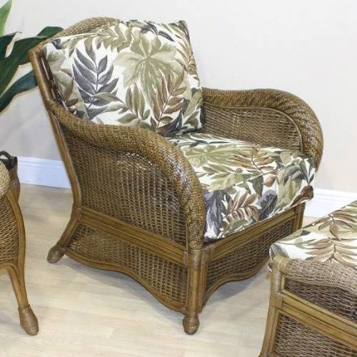 This wicker lounge chair is incredibly comfortable with the colorful cushions.Includes cushion with choice of fabric in a variety of colors and patterns Fully Assembled Woven Leather Bindings lampakanay a twisted rope like materialAssembly Required: No Collection: Turks Bay Country of Origin: Phillippines Depth: 36 Finish: Antique Height: 36 Material: Rattan Poles Woven Wicker Weight: 25 Width: 31